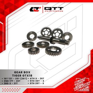 Gear box QTT dirancang dengan hitungan yang berbeda dari standardnya untuk kebutuhan Race maupun Harian dan sudah melalui finisihing hardent sehingga ketahanan lebih kuat. Dengan mengetahui rasio gear box, maka dapat diketahui berapa kali mesin berputar untuk menggerakkan roda kendaraan. Semakin tinggi rasio gear box, semakin kecil putaran mesin yang dibutuhkan untuk menggerakkan kendaraan pada kecepatan tertentu. Hal ini dapat membantu meningkatkan efisiensi bahan bakar dan performa kendaraan. Maka dari itu pastikan untuk hitungan rasio sesuai dengan kebutuhan mesin dan track yang di butuhkan