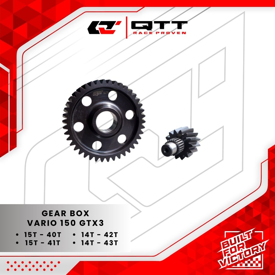 Gear box QTT dirancang dengan hitungan yang berbeda dari standardnya untuk kebutuhan Race maupun Harian dan sudah melalui finisihing hardent sehingga ketahanan lebih kuat. Dengan mengetahui rasio gear box, maka dapat diketahui berapa kali mesin berputar untuk menggerakkan roda kendaraan. Semakin tinggi rasio gear box, semakin kecil putaran mesin yang dibutuhkan untuk menggerakkan kendaraan pada kecepatan tertentu. Hal ini dapat membantu meningkatkan efisiensi bahan bakar dan performa kendaraan. Maka dari itu pastikan untuk hitungan rasio sesuai dengan kebutuhan mesin dan track yang di butuhkan